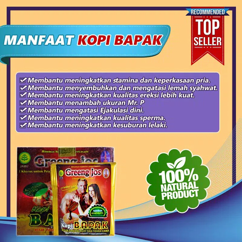 Kopi Bapak Greng Joss kopi nikmat kesukaan para pria ini terbukti ampuh menyembuhkan masalah disfungsi ereksi, ejakulasi dini dan cepat loyo saat berhubungan intim.